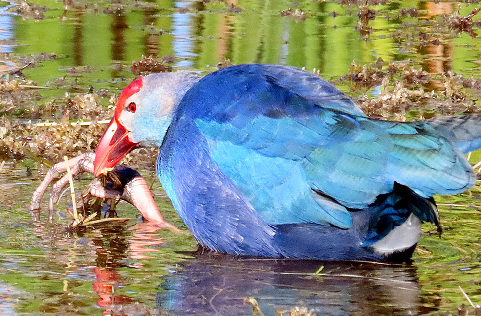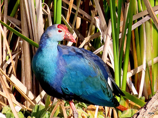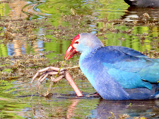 Here is another look that shows more of what must be flora, not fauna. If anyone knows what it is, kindly advise. If you look carefully at this last shot, you can see that the swamphen is currently working on ingesting a green marsh plant. “Good bird!” – for the moment at least.